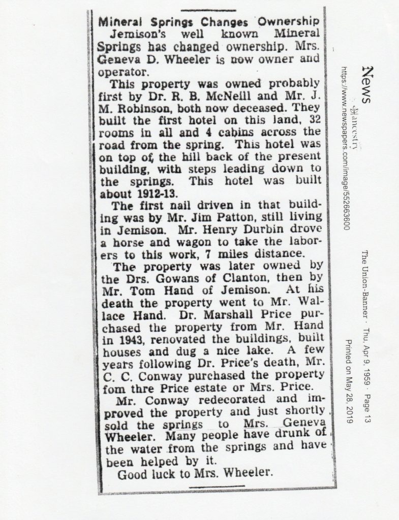 Then, in the year 1905, a new chapter unfolded as Doctor J.M. Robinson and Doctor R.B. McNeil stepped forward to acquire the property. The torch of ownership passed through the hands of Dr. J.E. Gowan before finding its resting place with Tom Hand of Jemison. Under their stewardship, a metamorphosis occurred, transforming Mineral Springs into not just a hospital, but also a haven of health, a resort for picnics and vacations.